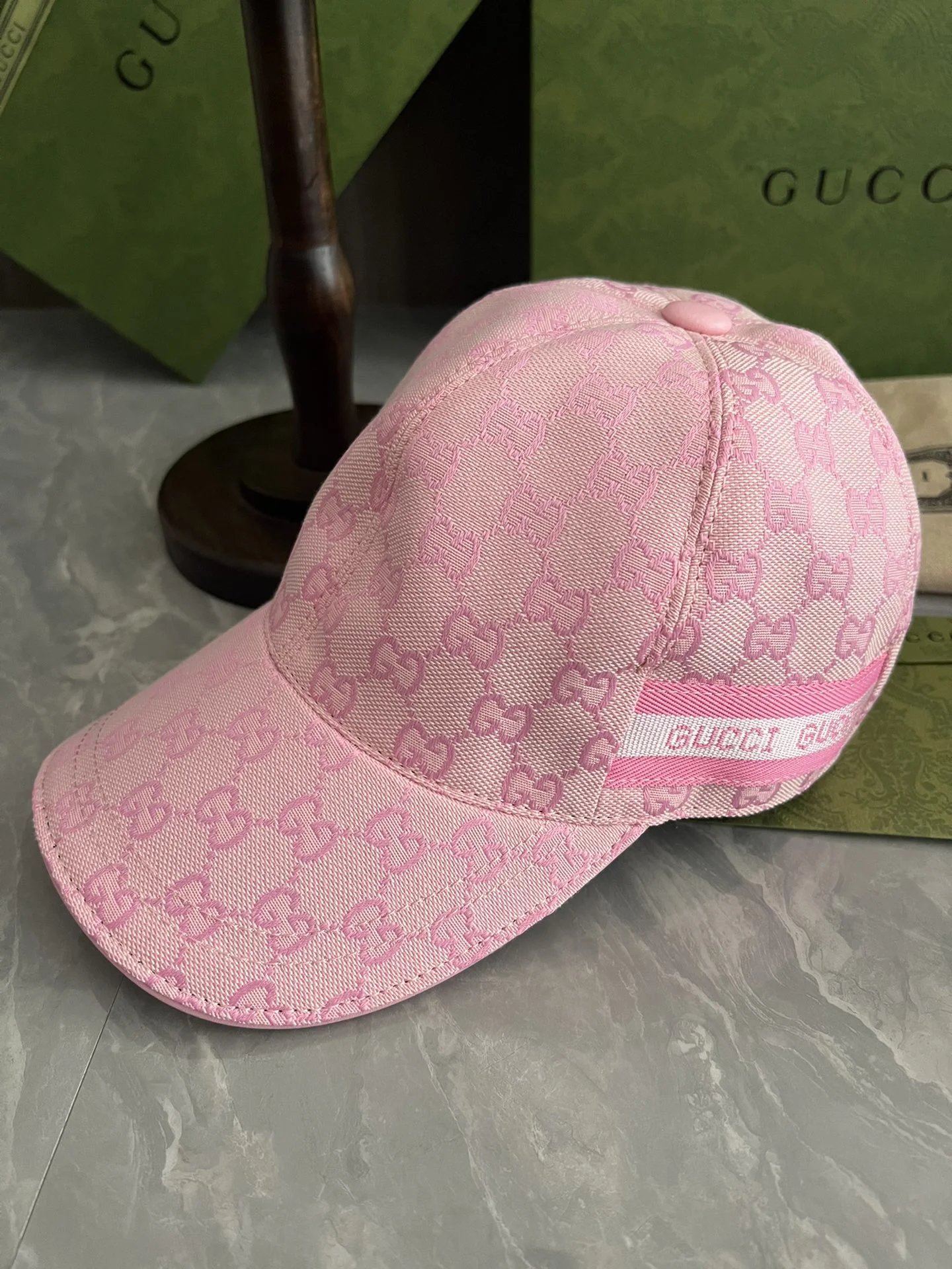 This Gucci Cap is a statement luxury accessory crafted with premium-quality fabric and an all-over GG monogram design. The soft pink tone adds a modern and fashionable touch, making it ideal for casual outfits, streetwear, and designer-inspired looks.
